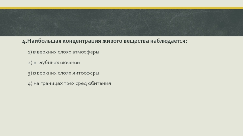 Слайд 124.Наибольшая концентрация живого вещества наблюдается: