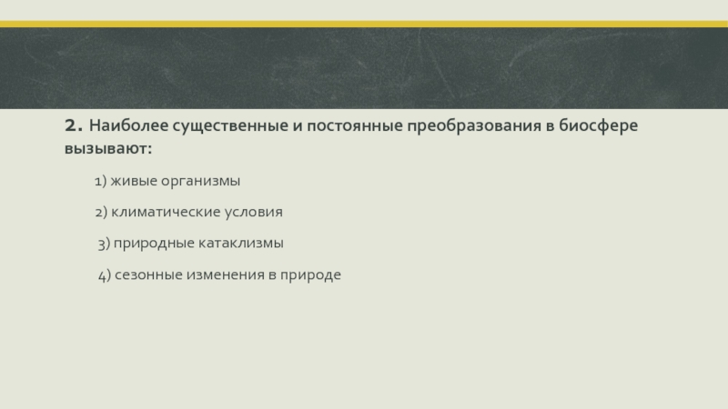 Слайд 102. Наиболее существенные и постоянные преобразования в биосфере вызывают: