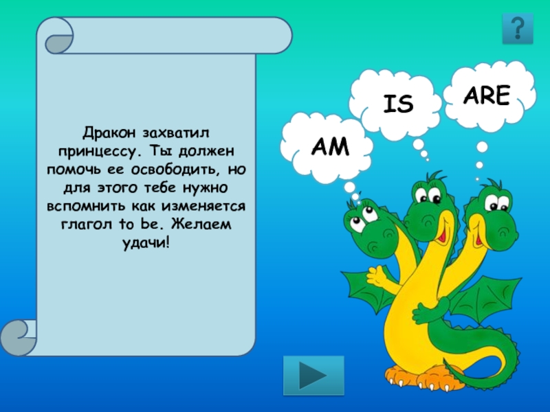 AMISAREДракон захватил принцессу. Ты должен помочь ее освободить, но для этого тебе нужно вспомнить как изменяется глагол to be. Желаем удачи!