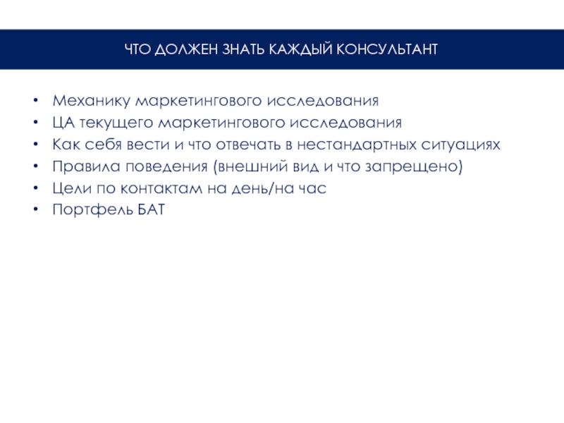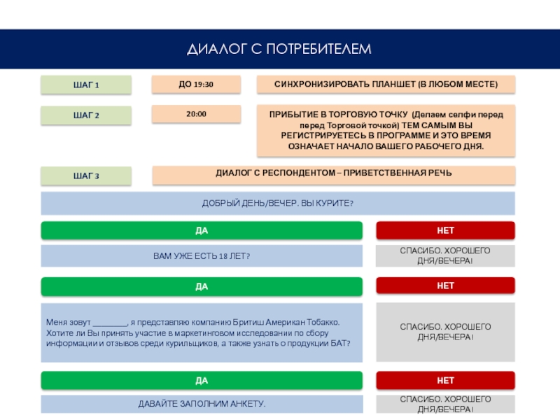 В случае, если Потребитель уже подходил к консультанту и уже состоит в базе данных БАТ, необходимо вежливо отказать в участии в маркетинговом исследовании