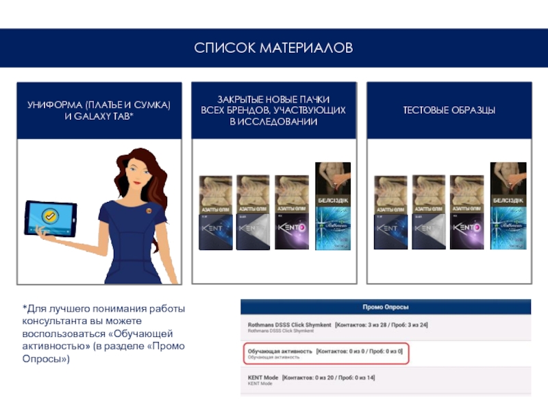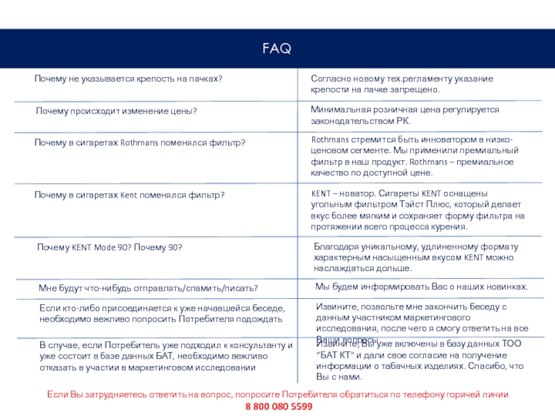реальную закрытую новую пачку Rothmans с вопросом «Хотели бы Вы рассмотреть закрытую пачку?», в случае положительного ответа дает респонденту в руки пачку на момент рассказа о продукте. В случае отказа – консультант держит пачку в руках рассказывает про продукт: