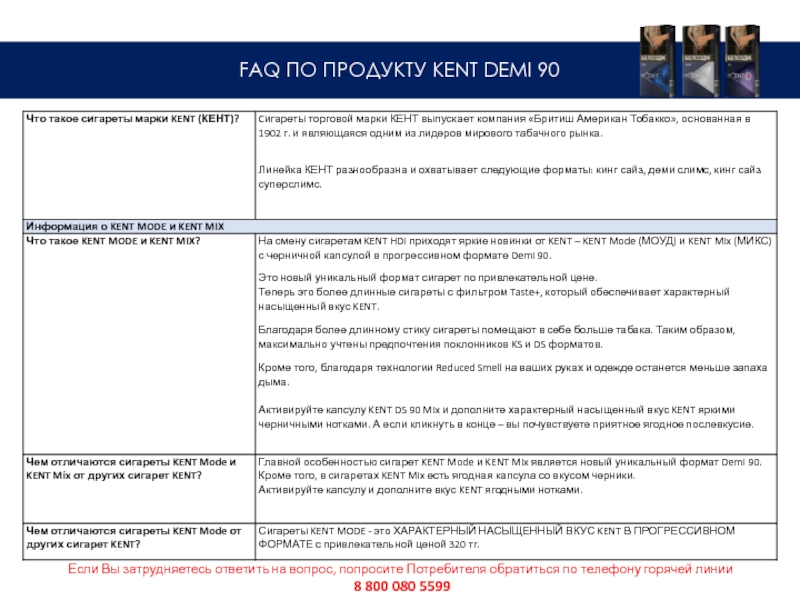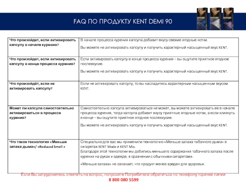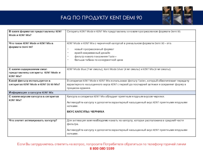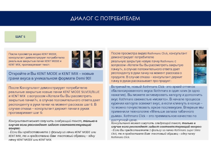 После Консультант демонстрирует потребителю реальные закрытые новые пачки KENT MODE SILVER/BLUE и KENT MIX с вопросом «Хотели бы Вы рассмотреть закрытые пачки?», в случае положительного ответа дает респонденту в руки пачки на момент рассказа шаг 6. В случае отказа – консультант держит пачки в руках проговаривает шаг 6: