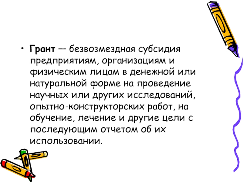 Грант — безвозмездная субсидия предприятиям, организациям и физическим лицам в денежной