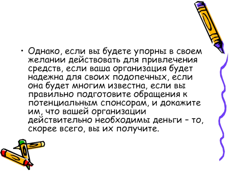 если она будет многим известна, если вы правильно подготовите обращения к потенциальным спонсорам, и докажите им, что вашей организации действительно необходимы деньги – то, скорее всего, вы их получите.