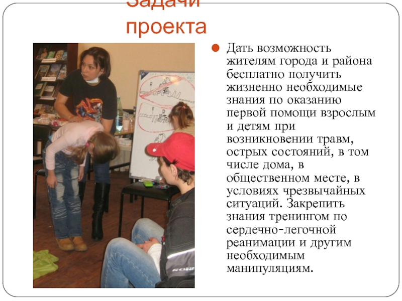 Задачи проектаДать возможность жителям города и района бесплатно получить жизненно необходимые знания по оказанию первой помощи взрослым
