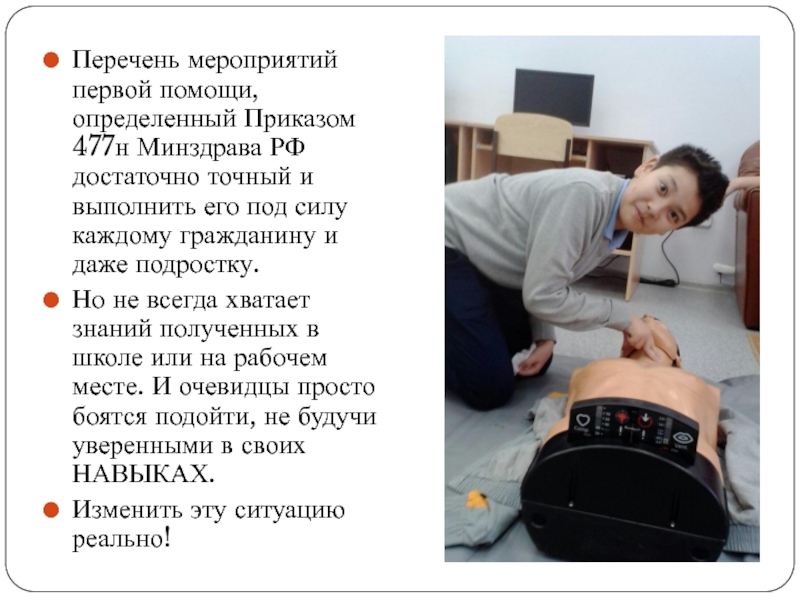 Слайд 6Перечень мероприятий первой помощи, определенный Приказом 477н Минздрава РФ достаточно
