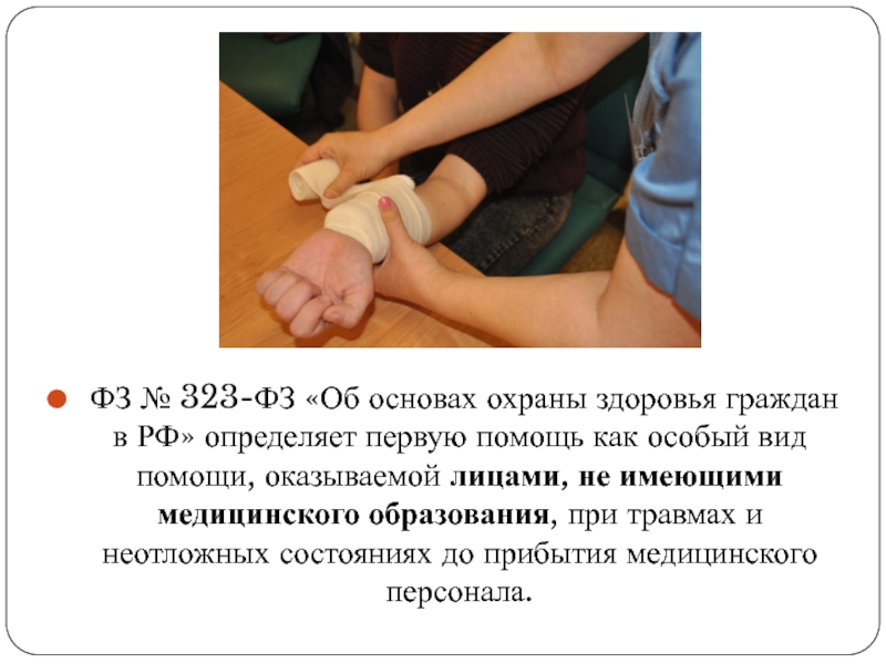 ФЗ № 323-ФЗ «Об основах охраны здоровья граждан в РФ» определяет первую помощь как особый вид помощи,