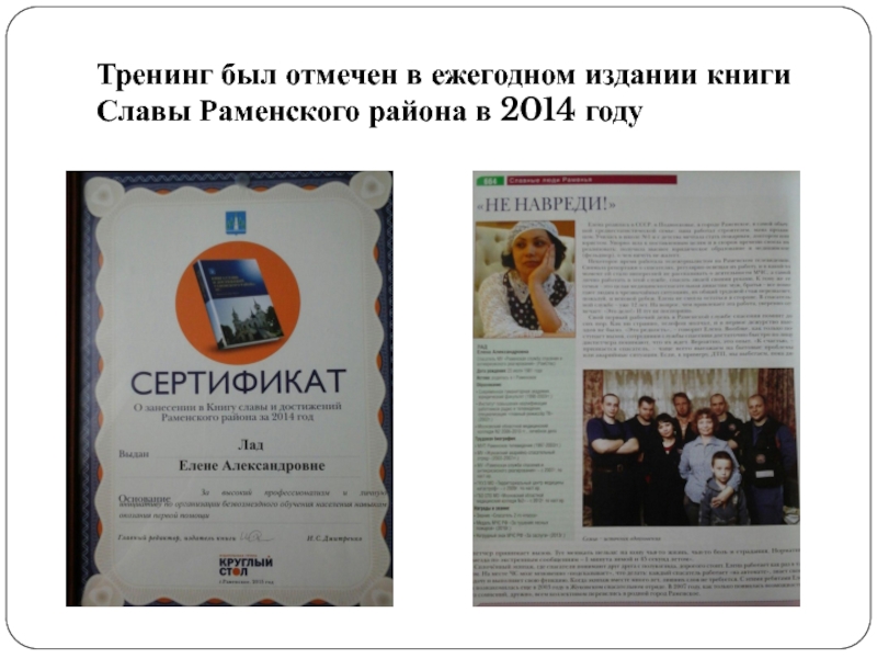 Слайд 12Тренинг был отмечен в ежегодном издании книги Славы Раменского района