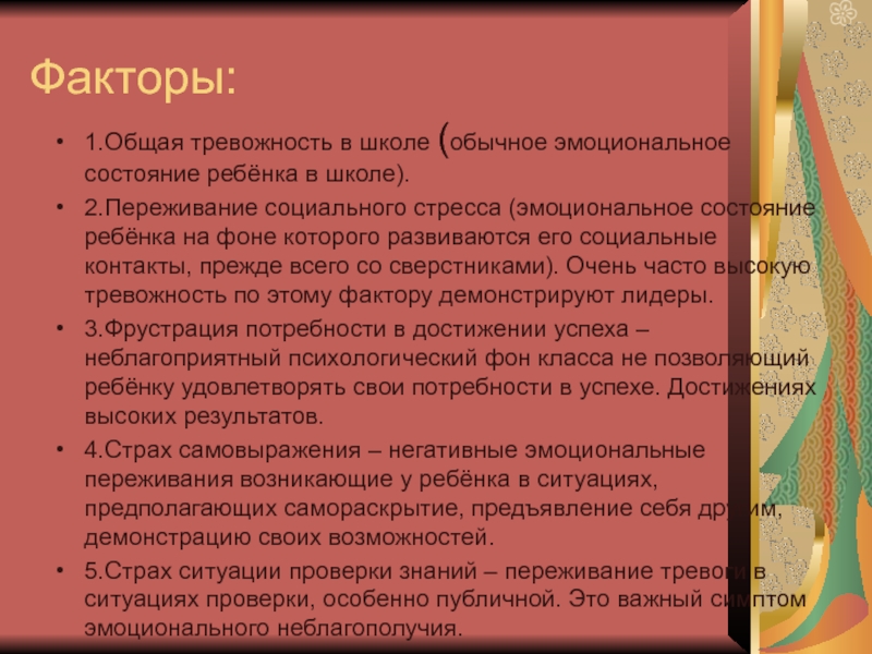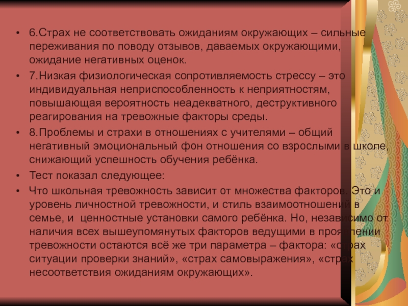Что школьная тревожность зависит от множества факторов. Это и уровень личностной тревожности, и стиль взаимоотношений в семье, и ценностные установки самого ребёнка. Но, независимо от наличия всех вышеупомянутых факторов ведущими в проявлении тревожности остаются всё же три параметра – фактора: «страх ситуации проверки знаний», «страх самовыражения», «страх несоответствия ожиданиям окружающих».