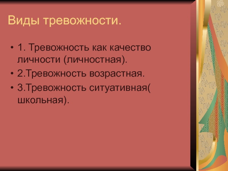 Слайд 4Виды тревожности.