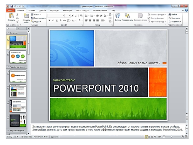 PowerPoint programmanyň penjiresi ýönekeý we has düşnükli bolan interfeýse eýedir. Ol prezentasiýany bezemek we netijeli döretmek üçin, ygtybarly zerur serişdeleri özünde jemleýär.