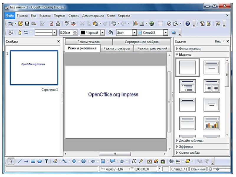 Ýagdaýlar setirinde işjeň slaýdyň belgisi, ulanylýan bezeg we tekst ýygmaklygyň dili görkezilýär.