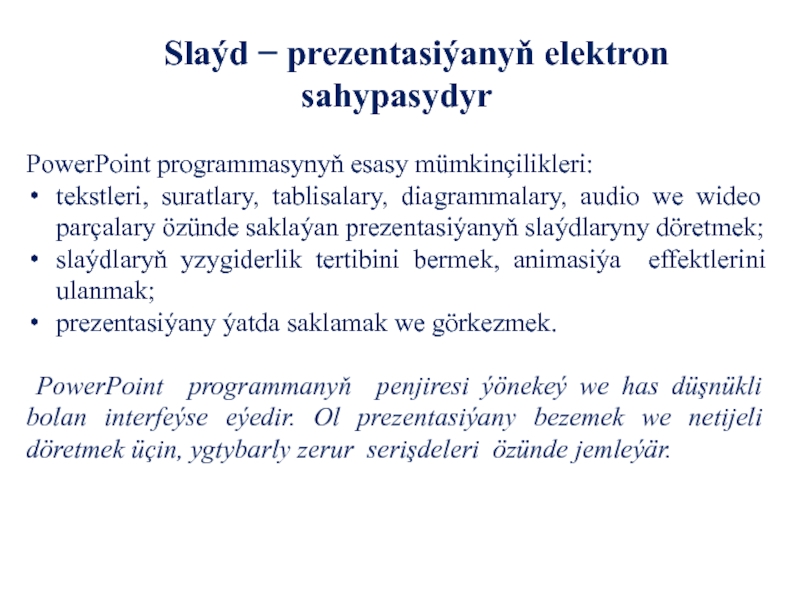 Slaýd − prezentasiýanyň elektron sahypasydyr 	 PowerPoint programmasynyň esasy mümkinçilikleri:tekstleri, suratlary, tablisalary, diagrammalary, audio we wideo