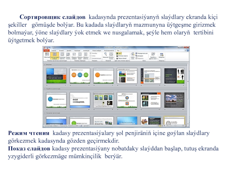 Слайд 9 Сортировщик слайдов kadasynda prezentasiýanyň slaýdlary ekranda kiçi şekiller görnüşde