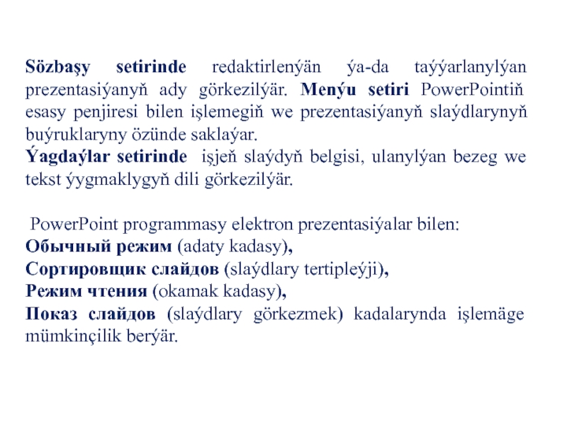 Показ слайдов (slaýdlary görkezmek) kadalarynda işlemäge mümkinçilik berýär.