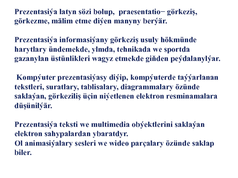 Слайд 3Prezentasiýa latyn sözi bolup, praesentatio− görkeziş, görkezme, mälim etme diýen