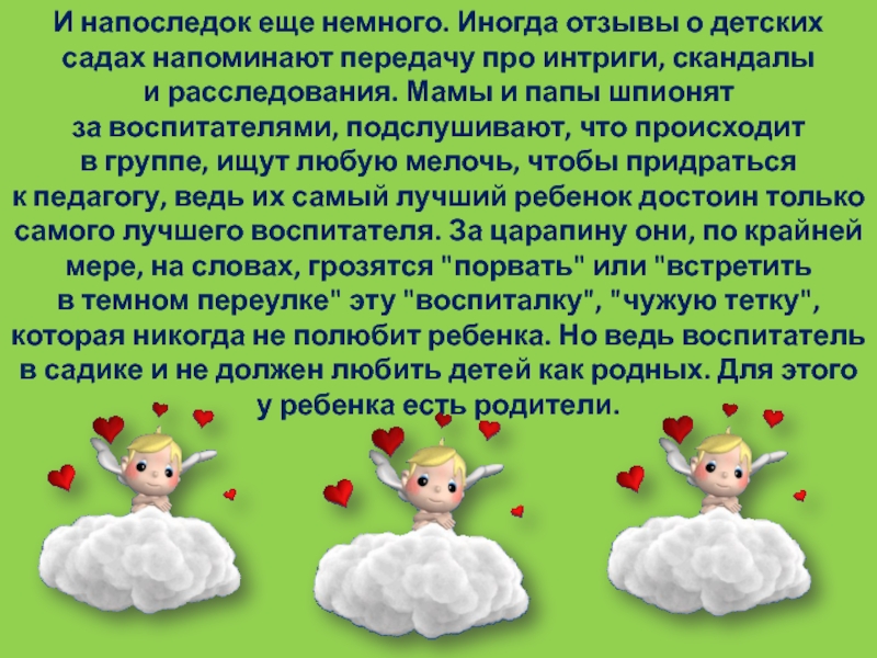в группе, ищут любую мелочь, чтобы придраться к педагогу, ведь их самый лучший ребенок достоин только самого лучшего воспитателя. За царапину они, по крайней мере, на словах, грозятся "порвать" или "встретить в темном переулке" эту "воспиталку", "чужую тетку", которая никогда не полюбит ребенка. Но ведь воспитатель в садике и не должен любить детей как родных. Для этого у ребенка есть родители.