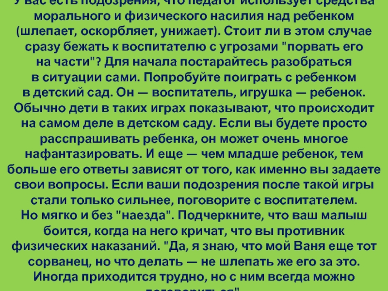 к воспитателю с угрозами "порвать его на части"? Для начала постарайтесь разобраться в ситуации сами. Попробуйте поиграть с ребенком в детский сад. Он — воспитатель, игрушка — ребенок. Обычно дети в таких играх показывают, что происходит на самом деле в детском саду. Если вы будете просто расспрашивать ребенка, он может очень многое нафантазировать. И еще — чем младше ребенок, тем больше его ответы зависят от того, как именно вы задаете свои вопросы. Если ваши подозрения после такой игры стали только сильнее, поговорите с воспитателем. Но мягко и без "наезда". Подчеркните, что ваш малыш боится, когда на него кричат, что вы противник физических наказаний. "Да, я знаю, что мой Ваня еще тот сорванец, но что делать — не шлепать же его за это. Иногда приходится трудно, но с ним всегда можно договориться".