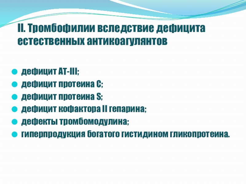 Слайд 11II. Тромбофилии вследствие дефицита естественных антикоагулянтов