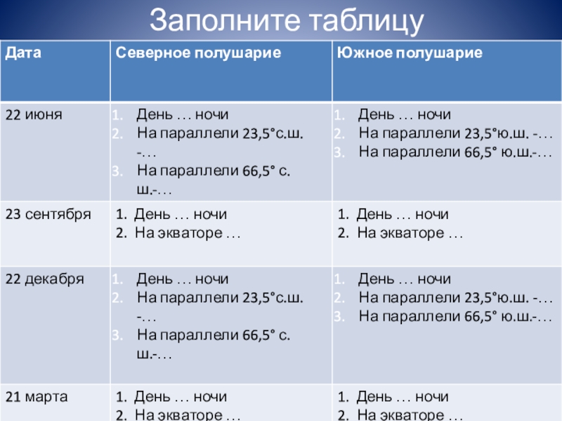 летнего солнцестояния (22 июня) Солнце в полдень стоит в зените над Северным тропиком, или тропиком Рака; В день зимнего солнцестояния (22 декабря) — над Южным тропиком, или тропиком Козерога.