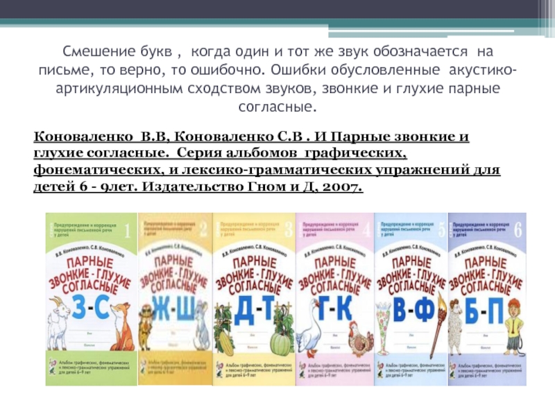 Коноваленко В.В, Коноваленко С.В . И Парные звонкие и глухие согласные. Серия альбомов графических, фонематических, и лексико-грамматических упражнений для детей 6 - 9лет. Издательство Гном и Д, 2007.