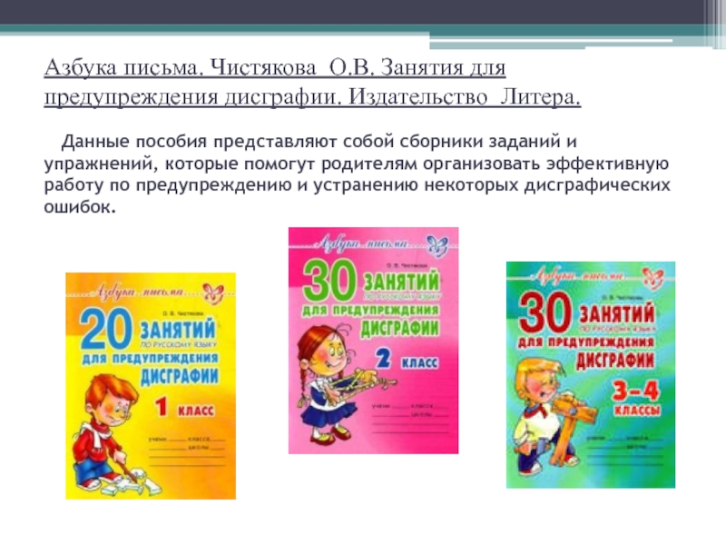 Слайд 23Азбука письма. Чистякова О.В. Занятия для предупреждения дисграфии. Издательство Литера.