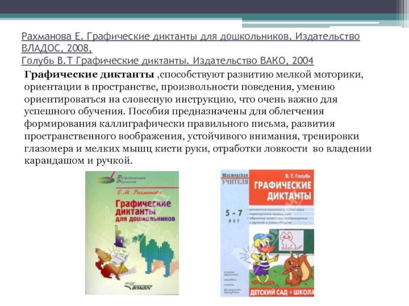 Слайд 20Рахманова Е. Графические диктанты для дошкольников. Издательство ВЛАДОС, 2008,