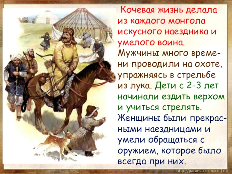 Слайд 5 Кочевая жизнь делала из каждого монгола искусного наездника и умелого