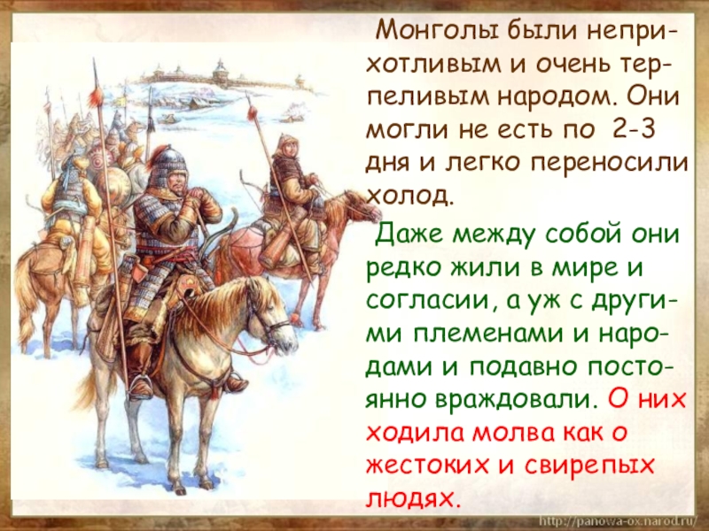 Слайд 4 Монголы были непри-хотливым и очень тер-пеливым народом. Они могли не