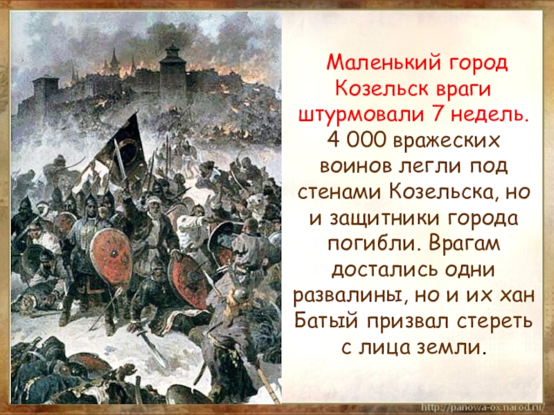 Слайд 9 Маленький город Козельск враги штурмовали 7 недель. 4 000 вражеских