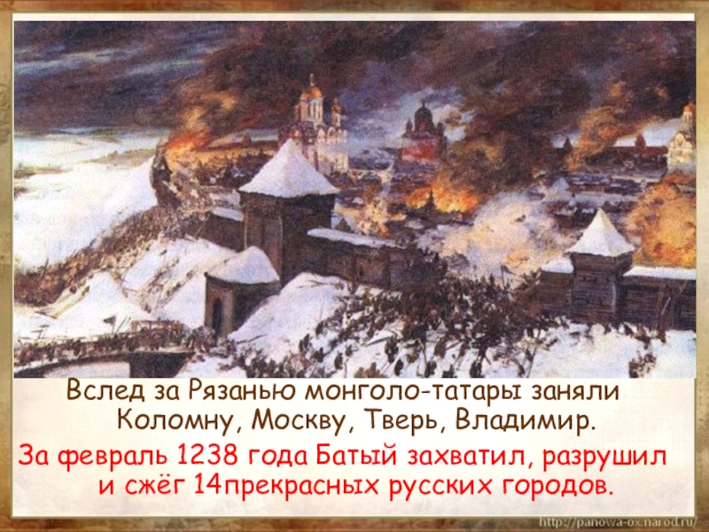 февраль 1238 года Батый захватил, разрушил и сжёг 14прекрасных русских