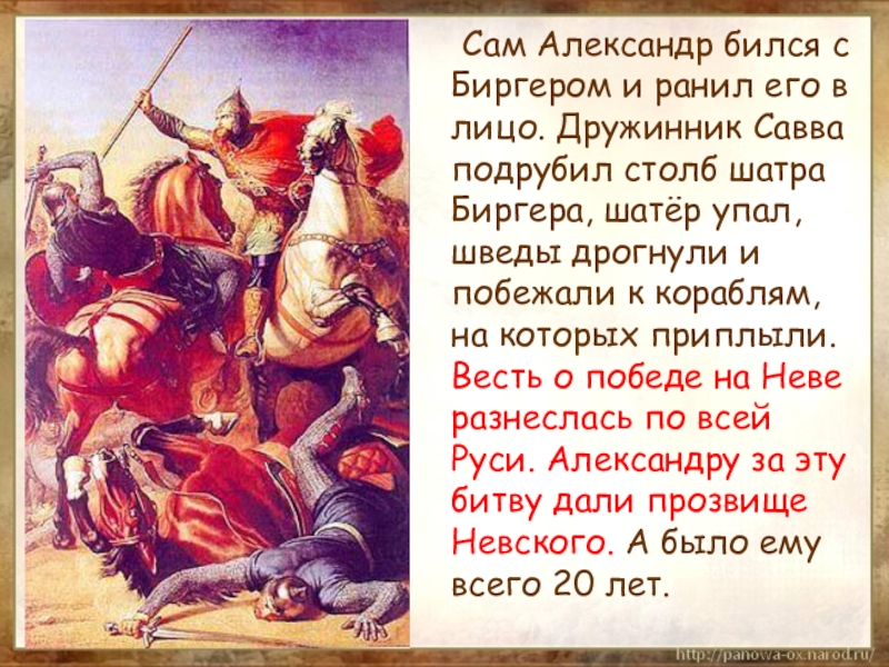и побежали к кораблям, на которых приплыли. Весть о победе на Неве разнеслась по всей Руси. Александру за эту битву дали прозвище Невского. А было ему всего 20 лет.