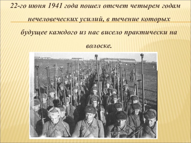 Слайд 422-го июня 1941 года пошел отсчет четырем годам нечеловеческих усилий,