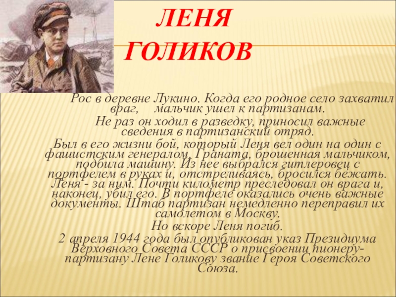 2 апреля 1944 года был опубликован указ Президиума Верховного Совета СССР о присвоении пионеру-партизану Лене Голикову звание Героя Советского Союза.