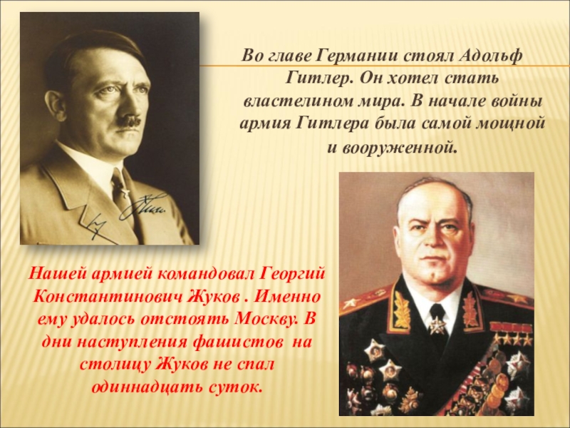 Нашей армией командовал Георгий Константинович Жуков . Именно ему удалось отстоять Москву. В дни наступления фашистов на столицу Жуков не спал одиннадцать суток.