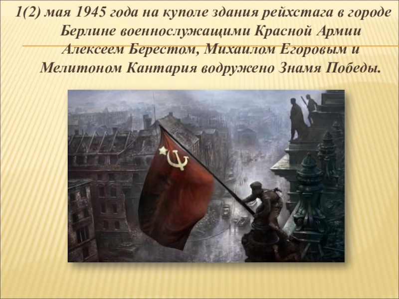 Слайд 191(2) мая 1945 года на куполе здания рейхстага в городе