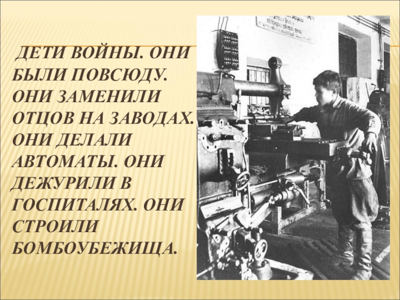 на заводах. Они делали автоматы. Они дежурили в госпиталях. Они