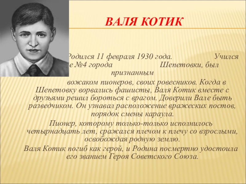 пионеров, своих ровесников. Когда в Шепетовку ворвались фашисты, Валя Котик вместе с друзьями решил бороться с врагом. Доверили Вале быть разведчиком. Он узнавал расположение вражеских постов, порядок смены караула.