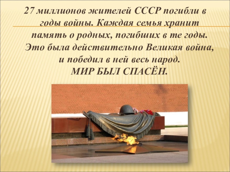 Слайд 2127 миллионов жителей СССР погибли в годы войны. Каждая семья