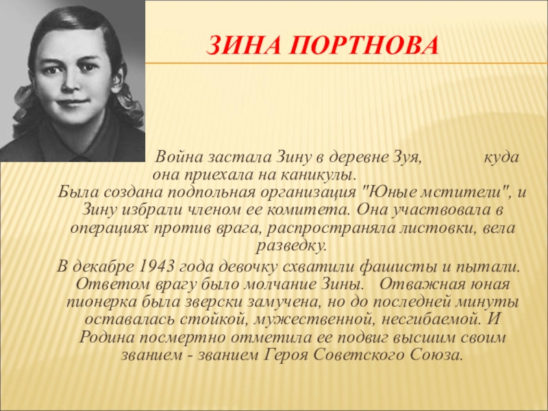создана подпольная организация "Юные мстители", и Зину избрали членом ее комитета. Она участвовала в операциях против врага, распространяла листовки, вела разведку.