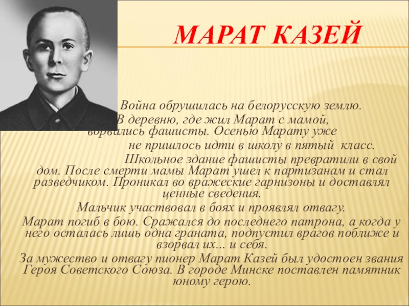 Школьное здание фашисты превратили в свой дом. После смерти мамы Марат ушел к партизанам и стал разведчиком. Проникал во вражеские гарнизоны и доставлял ценные сведения.