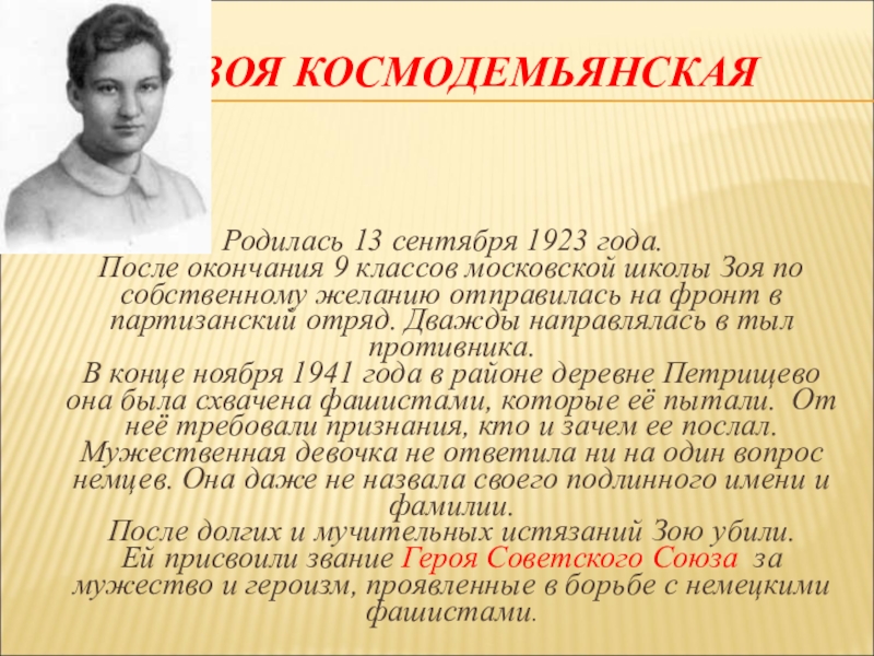 окончания 9 классов московской школы Зоя по собственному желанию отправилась на фронт в партизанский отряд. Дважды направлялась в тыл противника.
