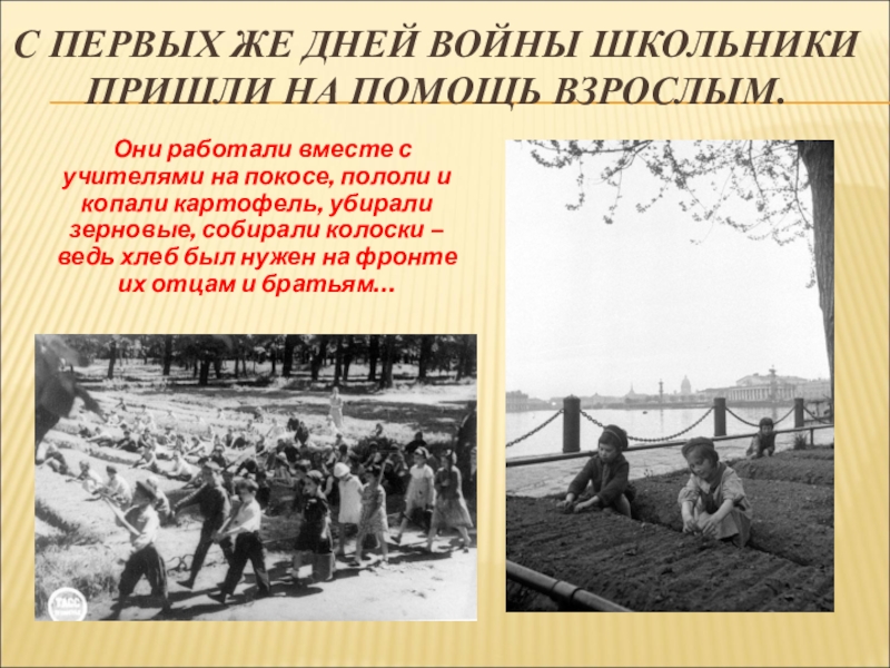Слайд 9С первых же дней войны школьники пришли на помощь взрослым.