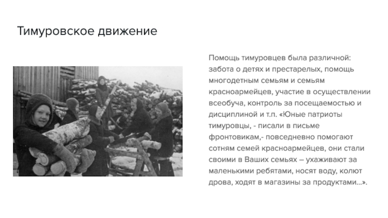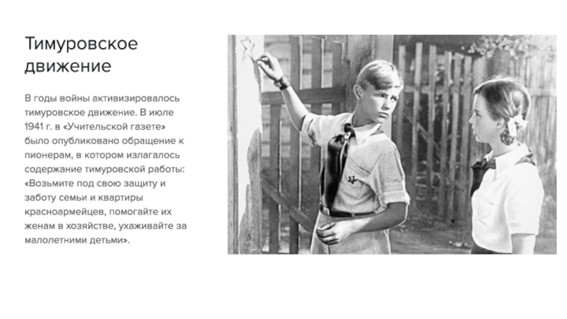 котором излагалось содержание тимуровской работы: «Возьмите под свою защиту и заботу семьи и квартиры красноармейцев, помогайте их женам в хозяйстве, ухаживайте за малолетними детьми».