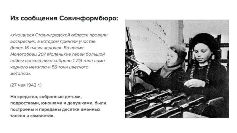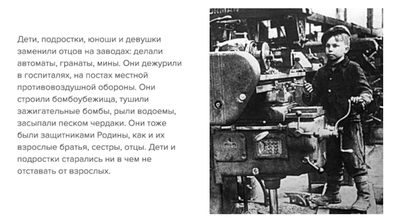 Слайд 5Дети, подростки, юноши и девушки заменили отцов на заводах: делали