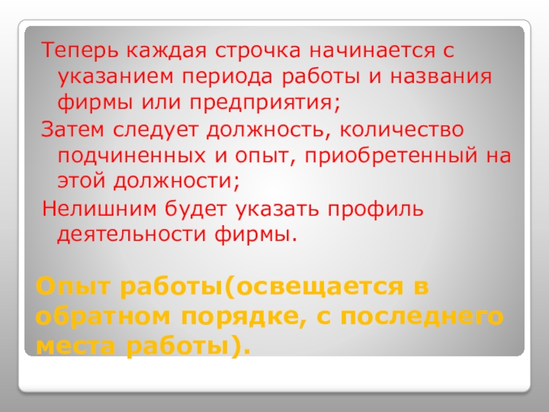 Слайд 10Опыт работы(освещается в обратном порядке, с последнего места работы).