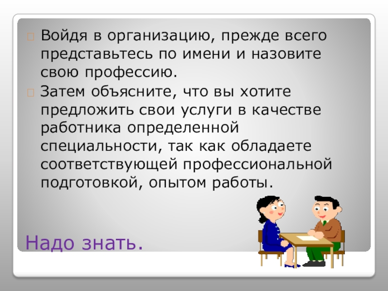 Войдя в организацию, прежде всего представьтесь по имени и