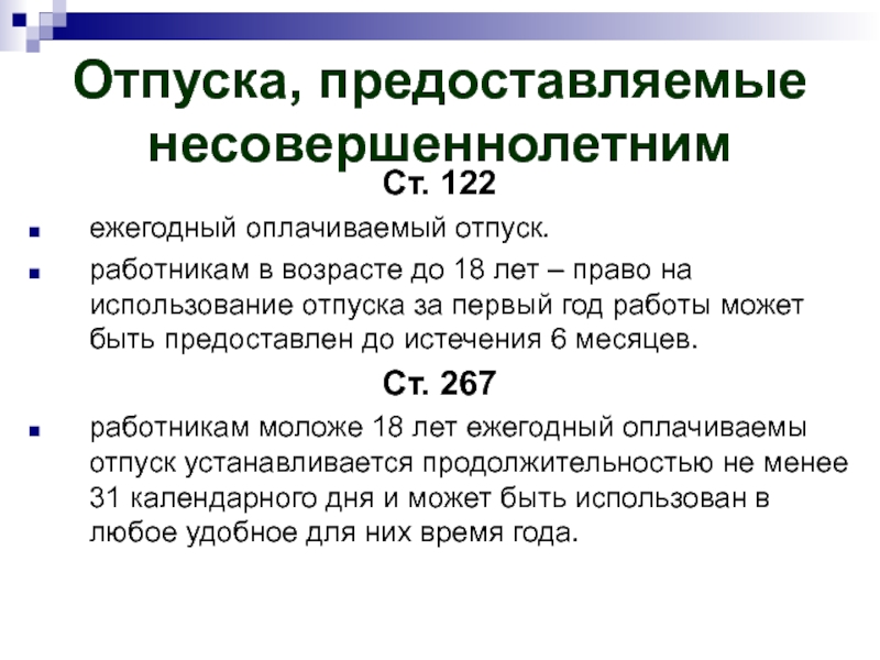 Слайд 33Отпуска, предоставляемые несовершеннолетним