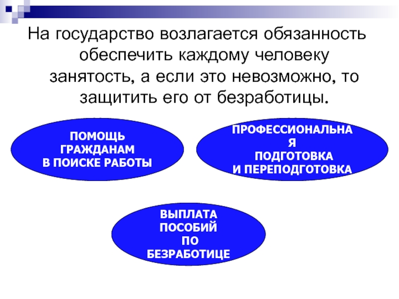 Слайд 37На государство возлагается обязанность обеспечить каждому человеку занятость, а если