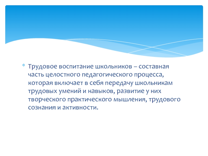 Трудовое воспитание школьников – составная часть целостного педагогического процесса, которая включает в себя передачу школьникам трудовых умений и навыков, развитие у них творческого практического мышления, трудового сознания и активности.